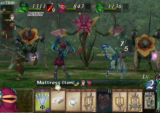 The gameplay is similar to Eternal Wings and the Lost Ocean and features a card-based battle system. Many items in the world have a “Magna essence”; these items can be captured in a card for use later. Some items are useful for attacking and defending, others can help replenish your health, and some can be used to solve puzzles. When a battle begins your deck of cards will be randomly dealt to you; battles are turn-based, on each turn you can select cards from those visible to use. Different cards also feature different attributes, and various combos are possible. When a battle is won, your characters will earn experience points, gold, and will also recover all hit points.