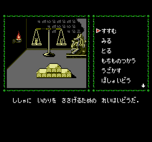 The game is an adventure/RPG hybrid, with simple turn-based battles occurring within the framework of a typical menu-based first-person adventure game. Movement, examination, and interaction are all achieved via menu options (go, look, take, use, etc.); battles simply restrict the menu to three basic combat options (attack, use item, or flee). The player character levels with experience, but this only determines maximum HP, while attack and defense are based on the best weapon and armor currently in inventory.