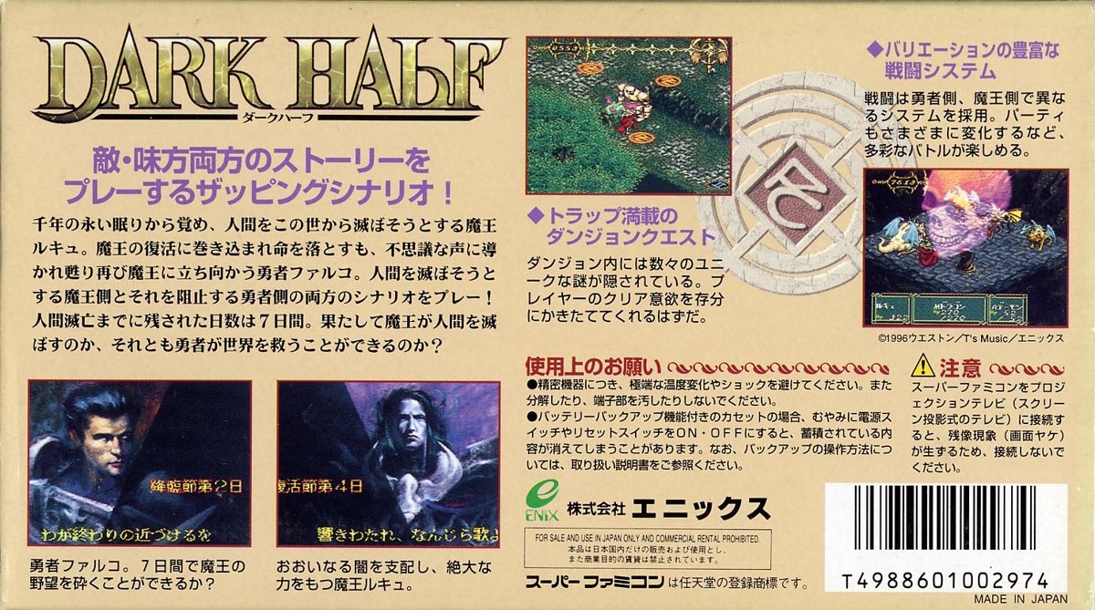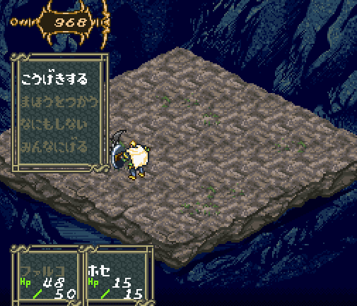 The game is quite different from most other RPGs, because it lets you play as both the “good” hero and the villain. The game is divided into chapters, and each chapter is played by either Roda or Rukyu. You switch the two heroes chapter-after-chapter, and lead them to their ultimate battle from two opposite sides. The entire game, including the battles, is viewed from an isometric perspective. The battles are random and turn-based, and the battle field is divided into squares you can position and move your characters on. Both Roda and Rukyu can have party members join them, and both attack mostly with magic. Rukyu uses a special energy called “Soul Power”, while Roda cast one-time spells from scrolls he receives after battles.