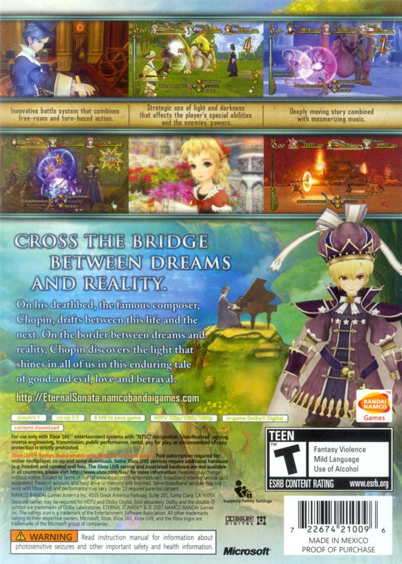 The hero of Eternal Sonata is a real historical character, the famous 19-century Polish composer Frédéric Chopin. The game begins with Chopin lying on his deathbed and having a strange dream in which he is transferred into a fantasy world where places and people have musically sounding names. Chopin encounters a girl named Polka, a magician who is on the run from her own destiny (since all magicians die young in her world). Other people join them on a quest to overthrow an evil nobleman. Events from Chopin’s real life are shown as parallels to what happens in his dream.