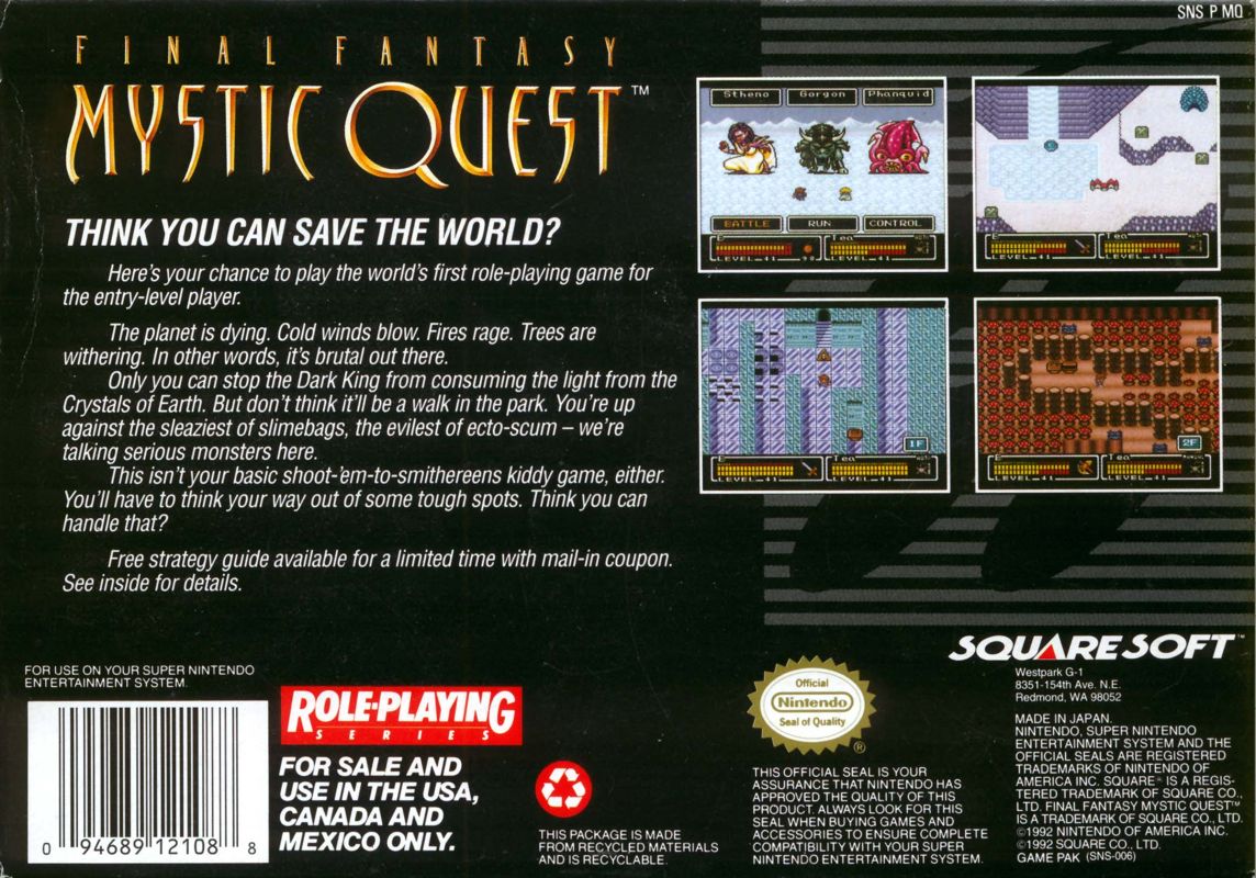 Final Fantasy: Mystic Quest is an RPG game, shown from an overhead view for movement within areas and using a 3rd person view for battles. The game is divided into “areas” on the world map between which the player can freely jump. These areas are divided into Towns, Dungeons and Battle Areas. Towns feature characters to interact and talk to, Dungeons are mazes filled with monsters and Battle Areas are instant battles with specific monsters, completion of which sometimes awards special items. Inside a Dungeon or Town, the player moves from an overhead view, with he ability to jump, use weapon at whatever is in front of the character, interact with NPCs and attack monsters.