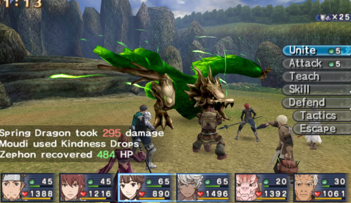 Genso Suikoden: Tsumugareshi Hyakunen no Toki is a Suikoden game taking place in a universe outside the main canon Suikoden series, The game doesn’t have random encounters as the player can see the enemies on screen and can usually choose when they want to enter into a turn based battle with an enemy or not. The turned based battle system retains the six party member standard of the earlier Suikoden games. In battle, the six party members can be placed in either the front, middle,or back row.with up to three characters per row. The game also offers a rudimentary job class system. For example, if the player wants to use a healing spell they will need a character who is a herbalist The nine main jobs are Spearman, Martialist, Swordsman, Archer, Ninja, Herbalist Jongleur, Magician and Shaman. It’s also possible for a character of one class to teach a character a skill of the same class (ie. A swordsman can teach another swordsman any skills they have learned). Most characters can also learn one additional job class from another party member which are unlocked through a character friendship system that involves characters dining together repeatedly.