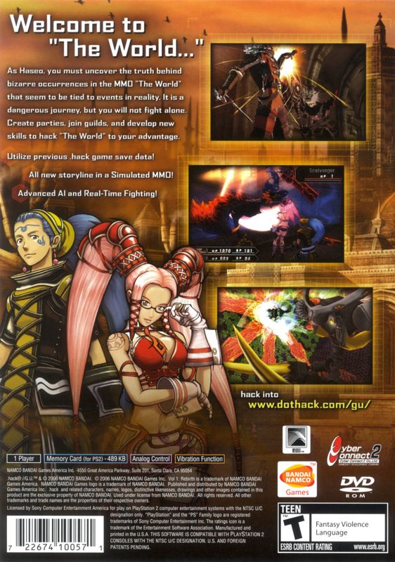.hack//G.U. Vol. 1: Rebirth takes place three years after .hack//QUARANTINE ended. One year after “The Twilight Incident”, a huge fire started in CC Corp destroying most of the original “The World” servers and forcing them to shut the game down soon after. A new version of the “The World” was created one year after the fire called “The World R:2”. You play as Haseo, a PKK (Player Killer Killer) searching for the player killer who Data Drained his friend into a coma, Tri-Edge.