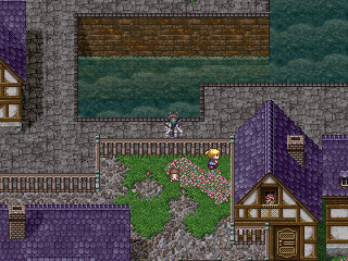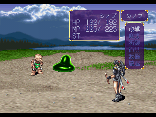 Kuro no Ken is a rather standard Japanese-style RPG with all the familiar ingredients: top-down locations, navigation on the world map, random enemies, turn-based combat, automatic leveling up, etc. The battles are viewed from a third-person perspective, using much larger character sprites than during exploration. Shinobu and Kayes can use physical attacks or magic spells (learned automatically when leveling up), which deplete MP.