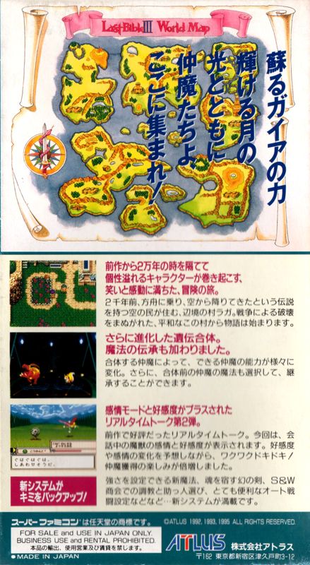 “Last Bible III” is a sequel to two Last Bible games for Game Boy and Game Boy Color. You control Shieru, a young boy who lives in a small village on a planet with a medieval civilization. With the help of his friends, he should fulfill an ancient prophecy and defeat the evil that threatens the planet. In order to do that, the heroes of the game have to recruit demons who will help them in battles.