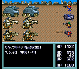 The game is a Japanese-style RPG with random encounters and turn-based combat viewed from third-person perspective, like in Final Fantasy games. There are two kinds of combat in the game: standard character-to-character combat, and vehicle battles. vehicles can be purchased, equipped, and modified just like the characters themselves. Various vehicles have different special attacks, and there are plenty of items to collect that will upgrade and repair your vehicles. As a hunter, you can also hunt down various giant monsters that populate the world, and kill them for a reward.