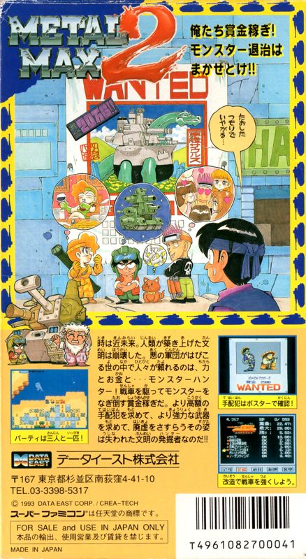 This is a sequel to Metal Max. The game is set in a futuristic world. An evil organization known as the Grapplers terrorizes the world, destroying entire cities if they notice a sign of resistance. The elders of Mado City invited four famous monster hunters to defend the city against the Grapplers. One of the hunters, Maria, brought a friend with her – this friend is you, the hero of the game. But even the hunters can’t withstand the Grapplers’ assault. Their leader, the giant machine-like Ted Broiler, kills Maria. You are left on your own, and you decide to fight the Grapplers and to become a hunter yourself.
