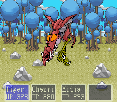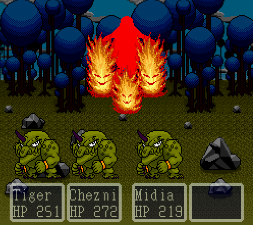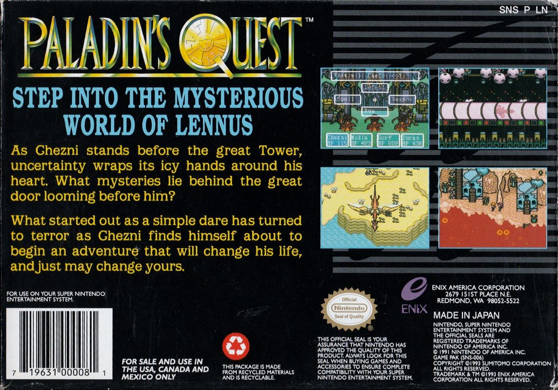 Paladin’s Quest is a 1-player RPG where the player moves around the world and in locations using an overhead view with up to four members in the party. Randomly encountered monsters engage in a first-person view battle mode that is played using turn-based commands to each player. Along with weapons, magic is available and uses the character’s own hitpoints to command. There is no healing magic and no healing items, rather some characters have “bottles”, one type of which can restore HP and these can be filled (nine uses per bottle) at most towns. Each character has a different profieciency in one of eight different elements, which may be combined to produce additional spells. New element usage can sometimes be learned by main characters in temples.