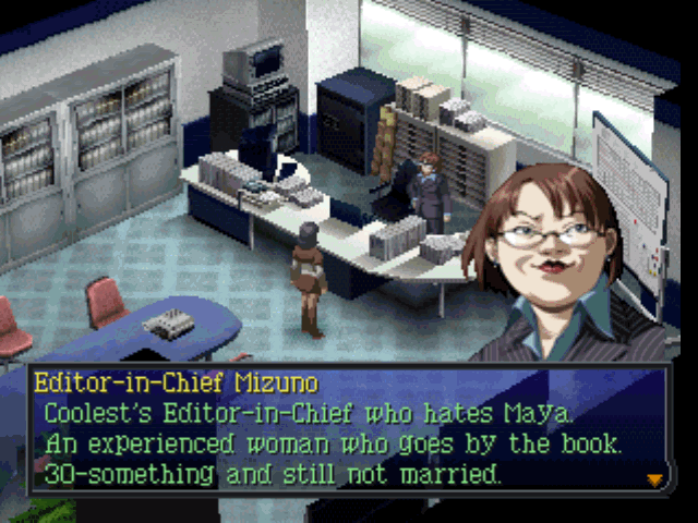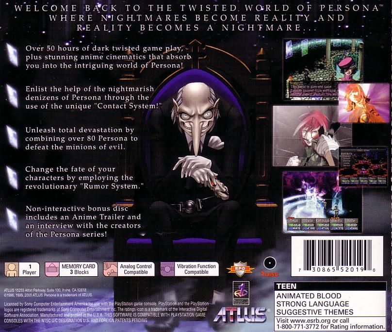 Eternal Punishment is a direct sequel to Persona 2: Innocent Sin. It can be considered its “mirror image”, since its story deals with many of the same characters, but is told from a different perspective. The gameplay system is nearly identical to that of the previous chapter. The player navigates a party of up to five active combatants on a city map, accessing maze-like dungeons and fighting randomly appearing demons in round-based combat. Like in the predecessor, successful verbal communication with a demon grants the party Tarot cards, which can then be used in a Velvet Room to summon Personae and equip them on characters.