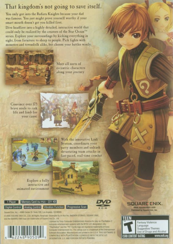 Radiata Stories is a lighthearted and humorous fantasy role-playing game from Square Enix. You control Jack as he travels from town to town, recruiting allies and taking on menial tasks. Of course there’s also a plot of saving the kingdom from certain doom, but there’s plenty of time for exploring and meeting people before you’ll need to worry about that. The game is fairly open-ended, allowing players to explore at their leisure.