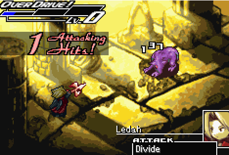 Once a turn-based battle is triggered, the player selects three active combatants out of the available five, selects a formation for the party (attack- or magic-oriented), and chooses which four items to bring into the battle. The items activate skills for various characters; if a character has been trained with that item, he or she can use powerful “OverSkills” by gradually filling the OverDrive gauge. Items can be used a limited amount of times before they break.