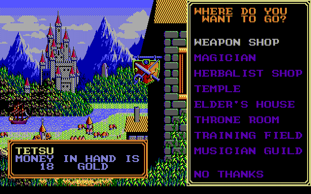 The game is an RPG with an unusual side-scrolling perspective and action-based combat, somewhat of a cross between Wizardry and platform games. Despite being a Japanese game, Sorcerian resembles Western RPGs of its time, focusing more on character development than story. In the beginning, the player creates a party of four characters, choosing between fighter, wizard, elf, and dwarf (races and classes are not distinguished). Beside the usual inns and shops, there are many things that can be done in the towns of the game, including complex development of magical spells (up to 120 spells of different disciplines), training to raise personal skills (strength, intelligence, etc.), enchanting weapons with elemental magic, as well as looking for part-time jobs.