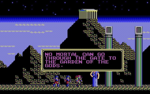 The view switches to side-scrolling when the party ventures into a hostile area. Combat is performed in real time, with the player controlling the entire party at once. The lead character can be changed at any time, and battle actions will be carried out by whoever is in front. Melee attacks and magic spells are unleashed by pressing corresponding buttons. The characters can also jump and interact with objects by bumping into them. Dungeons are usually maze-like, and some contain simple puzzles such as finding and activating hidden switches to open doors.