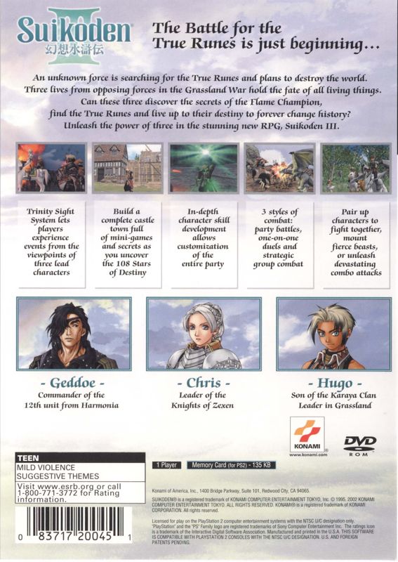 The events of Suikoden III take place sixteen years after those described in its predecessor. The game retains many distinguishing gameplay features from the series’ previous installments, including equipment of magic runes with limited spell uses instead of the more common magic points system; the possibility to recruit 108 characters (Stars of Destiny), many of which can participate in battles; customization of a castle serving as army headquarters, etc. Tactical army battle mechanics are similar to those employed in the second installment.