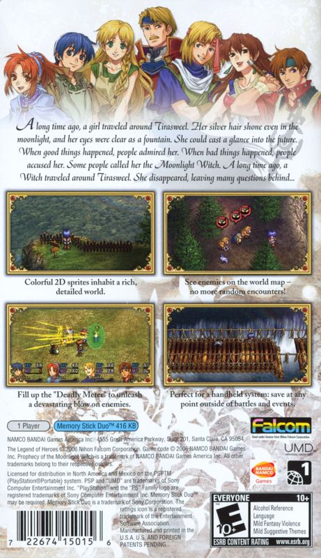 Prophecy of the Moonlight Witch is the remake of The Legend of Heroes III: Shiroki Majo (not released in the West), and the predecessor to A Tear of Vermillion. The remake is completely re-done in 3D. In this RPG, you talk to NPCs, solve quests, and fight battles. The fighting is turn-based, and relies on magic, brute force, summoned elemental spirits and items. There are skills to improve and special finishing moves. During your journey, a pet comes along and it will assist you in fights and collect items.