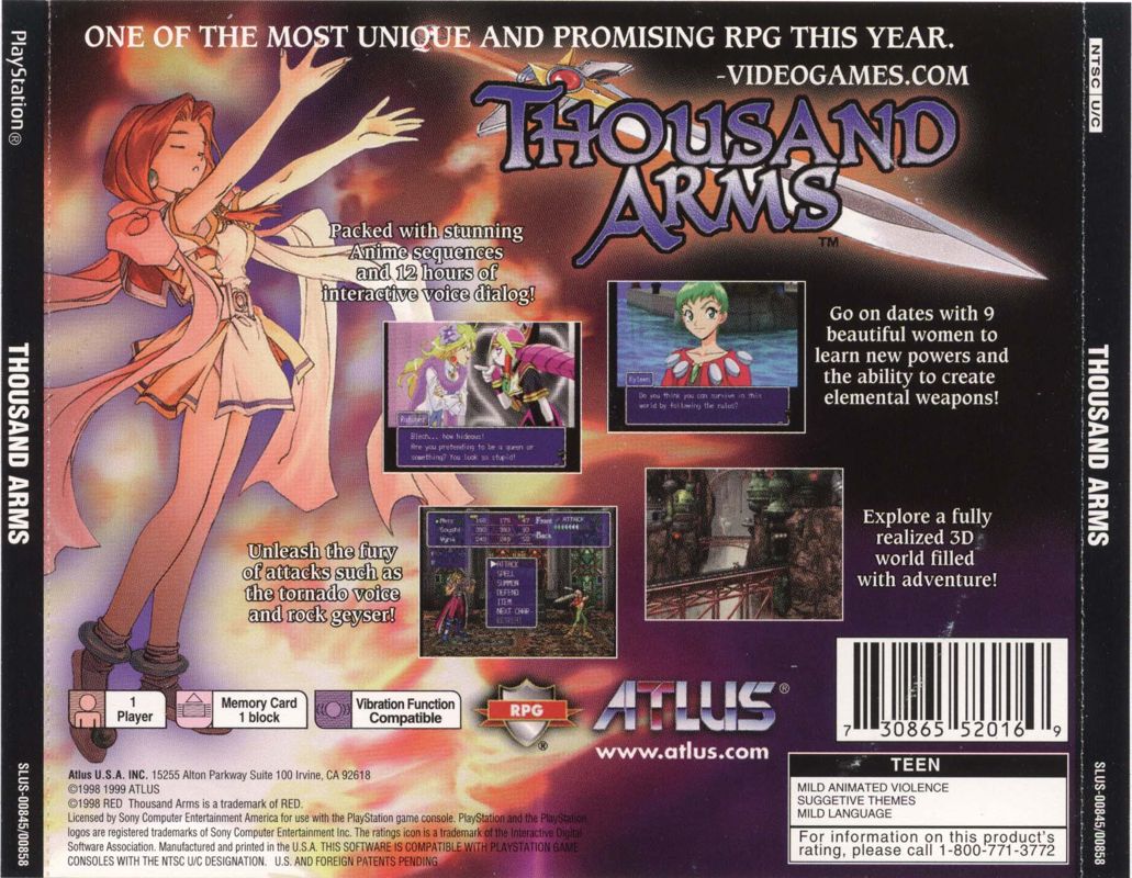 Thousand Arms is an anime-style role-playing game with turn-based combat, featuring 2D character sprites on polygonal background. Only one character can directly attack enemies during battles; the rest of the party play a support role with spells and items. Being a blacksmith, Meis can forge weapons for all the characters in the party by himself. To do so, he must seek out hidden spirits scattered through the game world, and secure the help of a female companion, who can imbue weapons with various spells and skills.