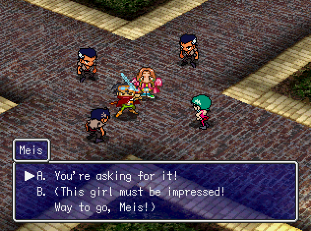 The latter requirement is fulfilled by dating the ladies that accompany Meis on his journey. The player can choose to date any of these young women by visiting statues of the Goddess of Love available in each town. During the date, the player must participate in a conversation with the girl, selecting responses. Depending on the player’s choice, the girl’s intimacy level will increase or decrease. Intimacy level can also be raised by offering gifts to a girl or participating in various mini-games.