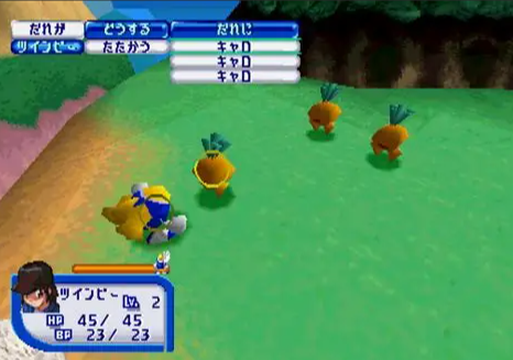 The game is played from a 3rd-person perspective from which you control Twinbee as he explores the land talking with NPCs for quests and items. Combat is active turn-based, a-la Final Fantasy with you selecting your actions while a timer counting down to the next enemy turn plays in real time. The game also allows you to incorporate different characters as party members, and depending on their abilities, they allow you to perform combo moves in which they join forces for additional damage.
