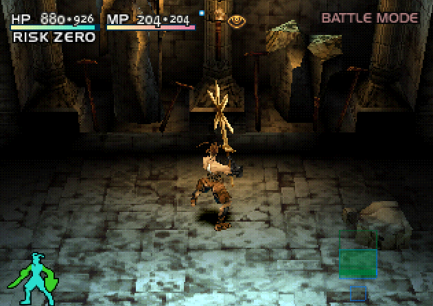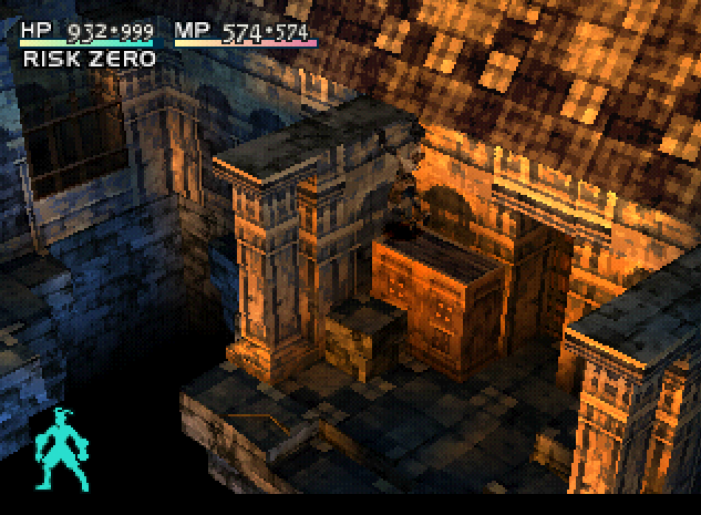 Vagrant Story is a role-playing game with several distinguishing characteristics. The entire game (including the numerous cutscenes that advance the plot) is rendered in 3D. The game focuses on exploration of large, complex dungeon-like areas and combat; there are no “friendly” areas, NPC interaction, or monetary system. Dungeons contain many optional rooms and environmental puzzles that mostly involve pushing, destroying, and re-arranging different types of crates to access higher areas. Ashley can also jump and grab ledges of higher platforms during exploration.