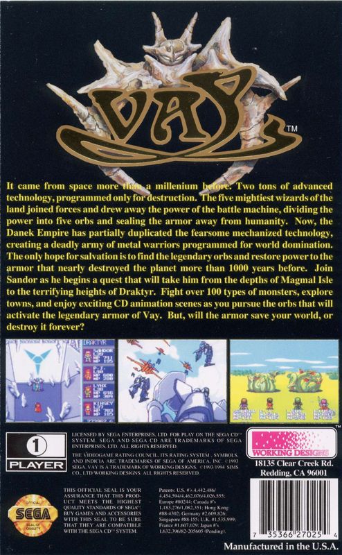 Vay is the story of Prince Sandor of Lorath, and his quest to avenge the assassination of his parents and rescue his beloved Lady Elin. On what is to be the day of their wedding, Castle Lorath is assaulted by the Danek, who have been able to partially reconstruct alien mecha technology from a millennium ago. The castle defenses are powerless against the giant robots, and the king and queen are killed in the attack. The invaders steal Elin in the midst of her wedding vows. Prince Sandor, now the king of the realm, sets out to rescue his betrothed, and find a way to defeat the fearsome alien technology.